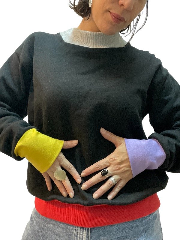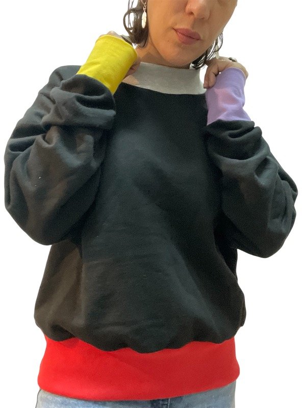 Buzo de diseño en friza negro y terminaciones en gris melange, amarillo, rojo furioso y lavanda
